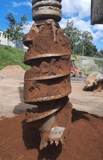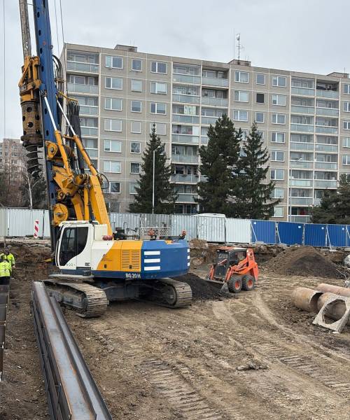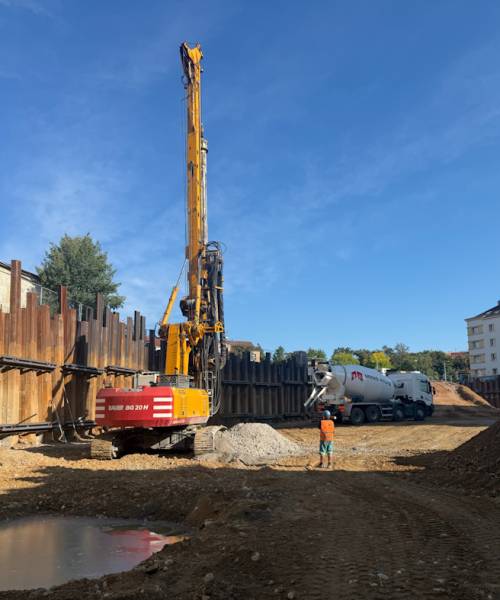 Na stavbě vrtá naše vrtačka BG20H a zapůjčený Soilmec. Vrtání probíhá skrz jílovité vrstvy bez potřeby pažení.