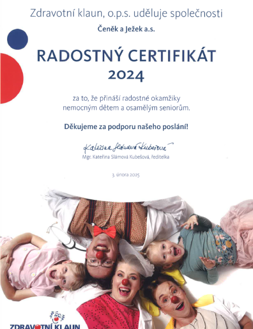 V roce 2024 jsme podpořili radost v nemocnicích a přispěli na dobrou věc prostřednictvím nadace Zdravotní klaun, o.p.s. V podpoře této nadace budeme pokračovat i nadále.