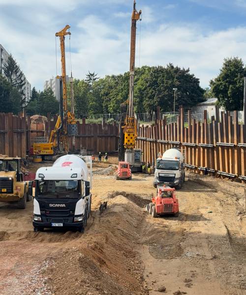 Plánovaná výstavba polyfunkčních domů v ulici Chelčického v Plzni už se rozjela a my máme na starosti zajištění stavební jámy a pilotové založení nového objektu.