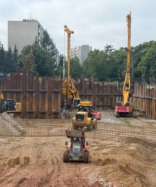 Na Jižním předměstí v Plzni se pracuje již uvnitř stavební jámy. Stavební jáma pažená štětovnicemi a převrtávanou pilotovu stěnou se postupně kotví a odtěžuje. V místě, kde naše firma realizuje i založení objektu na systémových pilotách, je jáma odtěžena již na ochrannou vrstvu, odkud aktuálně vrtáme piloty. Symfonii našich strojů můžete vidět na přiložených fotografiích níže.