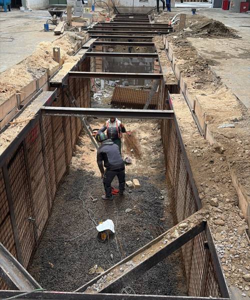 In another location, due to space constraints and the number of networks in the area (anchoring is not allowed), we will brace the sheeting pile wall with a steel frame.