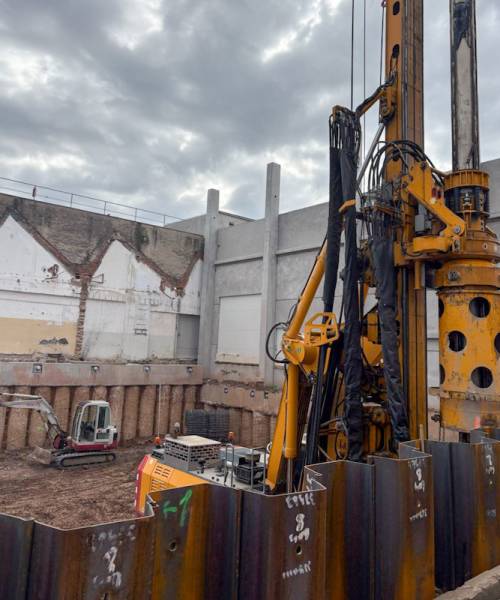 The subsoil of the construction site contains gravel and R6 sandstone, which gradually transitions to R4 (strength). It is not possible to drive sheet piles into such a solid bedrock, so now we are using a drill to break up the rock (pre-drill with a CFA drill), and then drive the sheet piles.