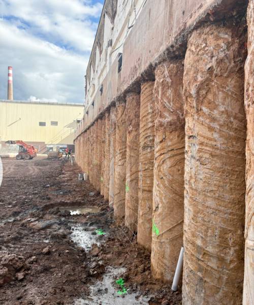 We are drilling piles under the storage hall (SO38) and we are also going to execute a permanent pile wall, which will be used not only as a retaining wall, but will also work as a foundation for a few of the columns of the new hall. According to the project, the piles under the building (system piles) have a diameter of 750 and 900 mm, the pile wall will be made of piles with a diameter of 1000 mm. The wall will be coupled with a reinforced concrete beam at the top and anchored through the beam with permanent rope anchors towards the building. When preparing the project, it was necessary to pay great attention to ensuring that the designed anchors do not collide with the newly drilled system piles.