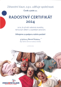 V roce 2024 jsme podpořili radost v nemocnicích a přispěli na dobrou věc prostřednictvím nadace Zdravotní klaun, o.p.s. V podpoře této nadace budeme pokračovat i nadále.